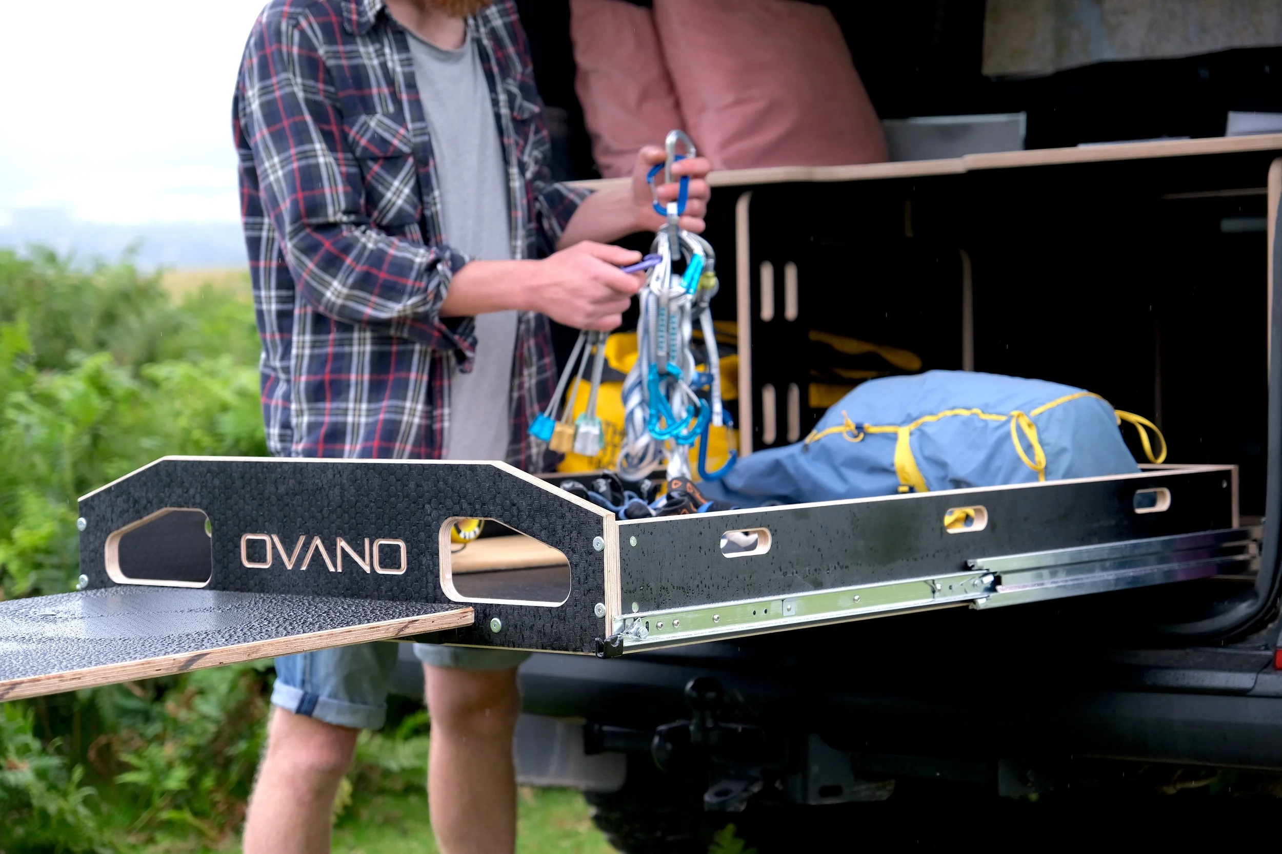 The super flexible Ovano Switch Narrow unit gives endless options for tool/equipment storage, whilst up top the load platform transforms into a full size double bed with a slide and click.